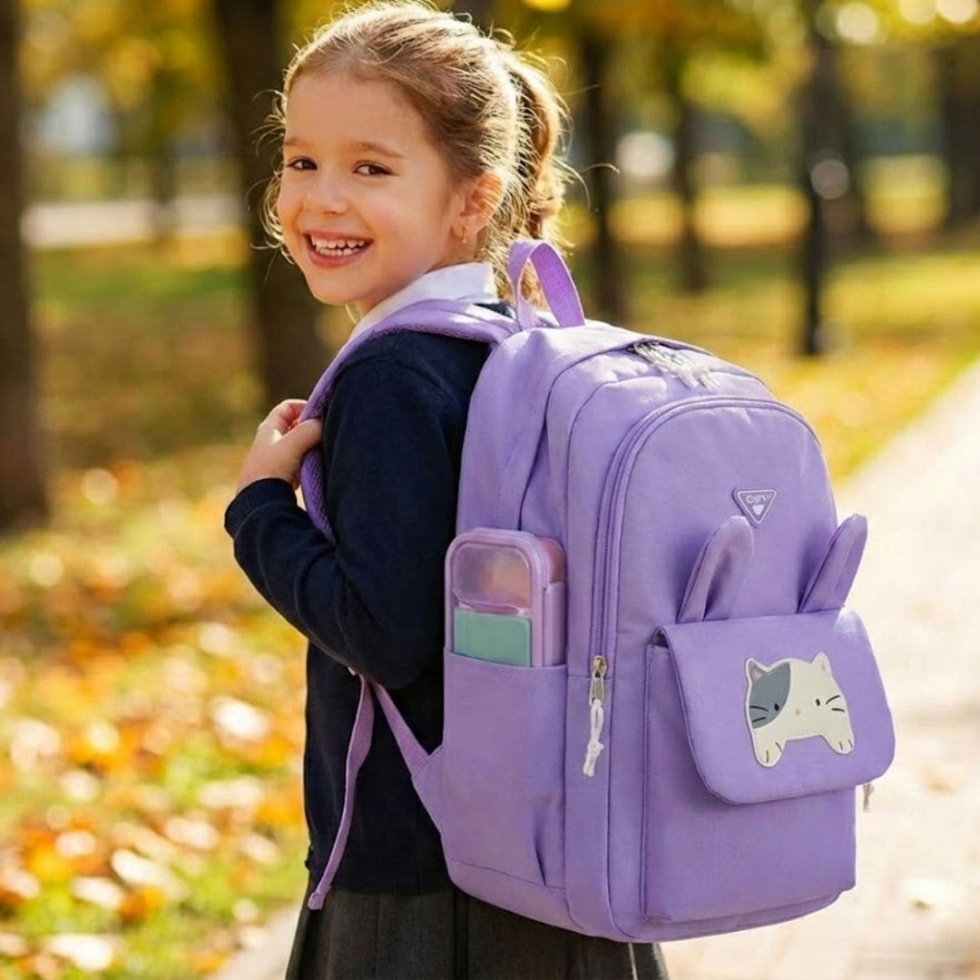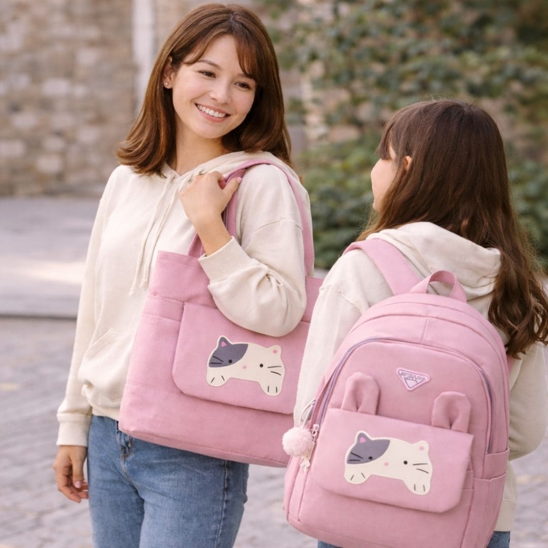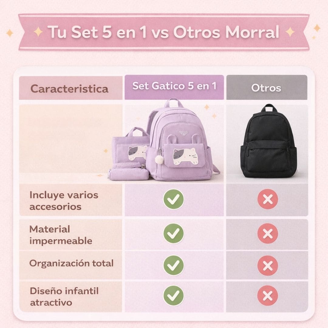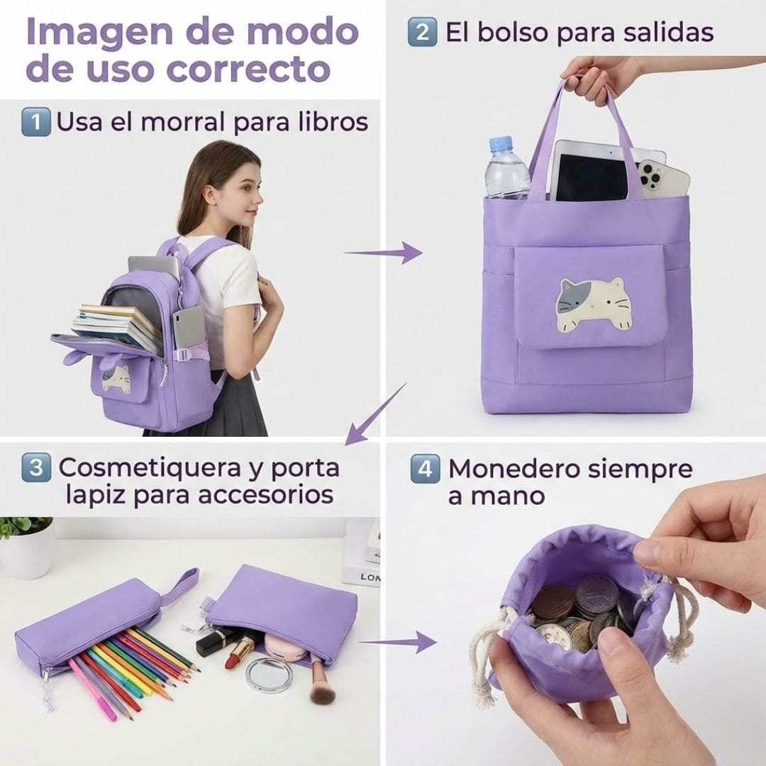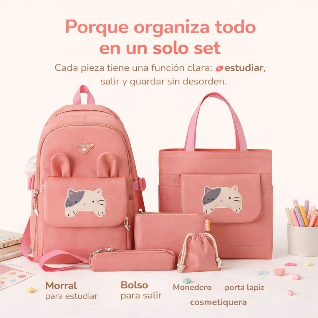 Con el Set Morral Gatico 5 en 1, todo tiene su lugar, se mantiene protegido del agua y tu hija se sentirá feliz y cómoda todos los días.